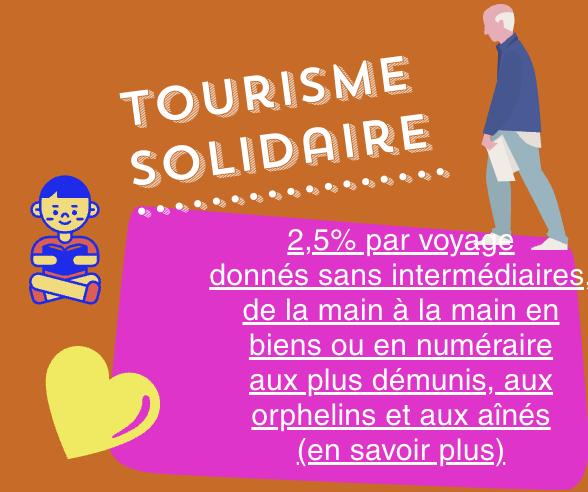 Dans le cadre d'une démarche responsable, nous reversons un % de 2,5% par voyage sous la forme de biens ou numéraire, vers les plus démunis.